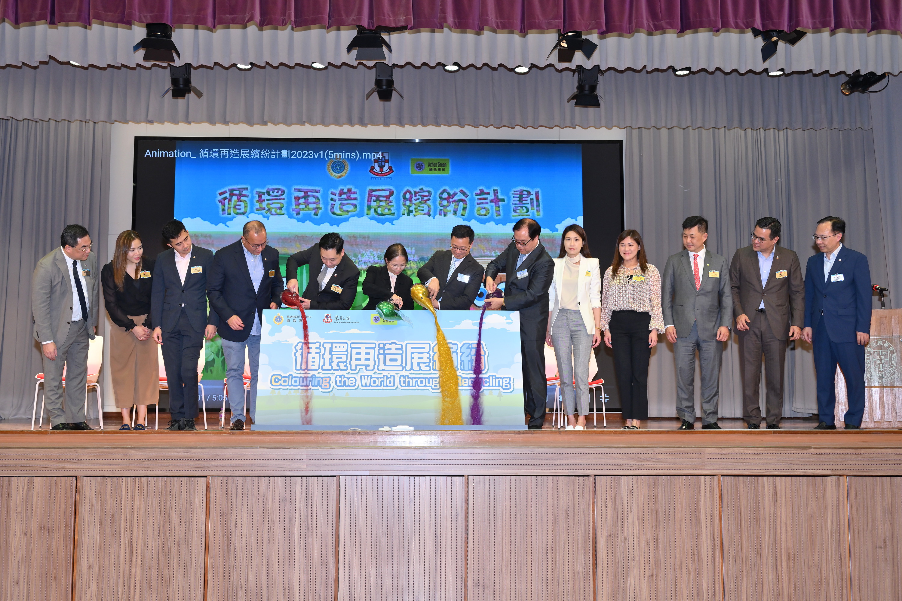 图1.1及图1.2为环境及生态局副局长黄淑娴太平绅士(左六)与惩教署署长黄国兴先生CSDSM(左七)、绿色环保互动委员会主席萧楚基BBS, MH 太平绅士(右六)及东华三院主席韦浩文先生(左五)连同东华三院董事局成员及行政总监苏祐安先生(左一),将玻璃砂倒入沙画,象征「循环再造展缤纷」活动正式启动。